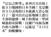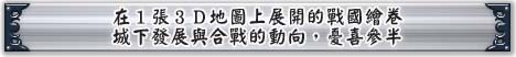 日本全國用1張3D地圖顯示,不僅賞心悅目,更增加戰場的臨場感。玩家可以在這個地圖上進行內政和會戰,至於畫面的表現如何,就讓我們分別以不同的場景來介紹吧!