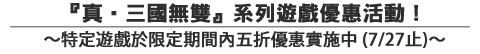 光榮特庫摩將於2016年7月14日(四)至7月27日(三)實施「『真‧三國無雙』15週年紀念 期間限定半價大拍賣」活動,此期間內於PlayStation®Store發佈中的「真‧三國無雙」系列作品之下載版遊戲將以一般價格的五折優惠價提供。