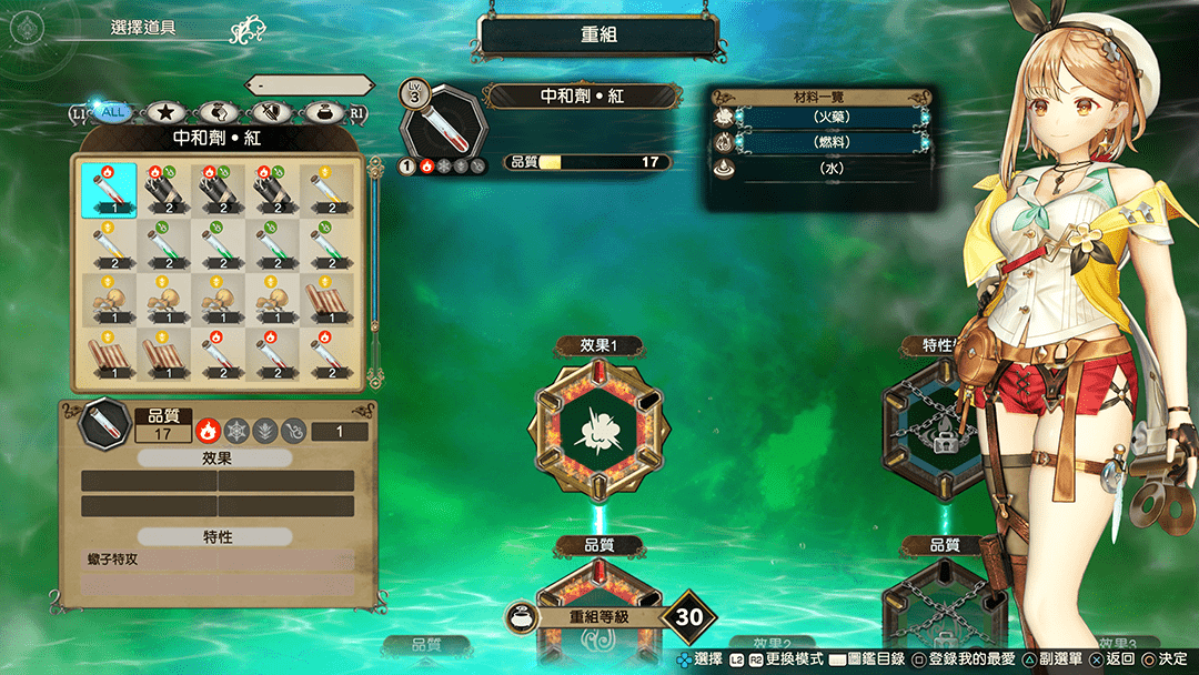 放入材料後,將依該材料的「屬性值+1」來提升道具等級。不過超過現在的重組等級後,就無法再放入材料。