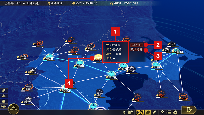每月可以獲得的資金收入。數字為白色的普通商圈可以「進駐」,數字為白色的特殊商圈可以「獨占」。數字為黃色的普通商圈,則已擁有超過成為大商圈所需的資金收入。