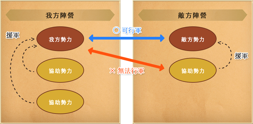 即使是敵方陣營,對於協助過的勢力無法「行軍」。要「行軍」的話,必須重新進行「宣戰」。