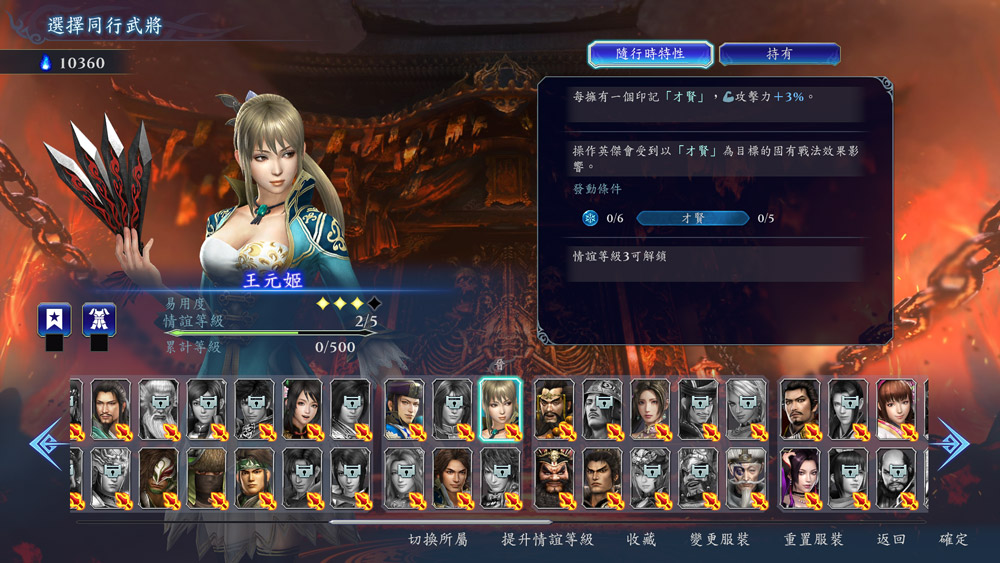 本能地履行「太平之要」的職責,憑藉能運用自如的武術,馳騁於無數戰場之上。新系統 「同行武將」在「選擇同行武將」中,可選擇與操作英傑一同出戰的隨行武將。