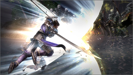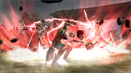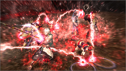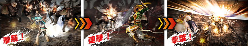 | 對四周施放衝擊波後,全員共同施放無雙亂舞。 | 最多達6名武將驅使的,深具壓倒性迫力的無雙亂舞。 |