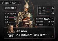 系統會將您的結果和「三國志」的英雄作一翻比較後評筆。這些會隨著連鎖的最大擊破數或所屬的武將數而改變,而「武藝•智謀•統率」則是評鑑的基準。