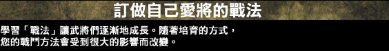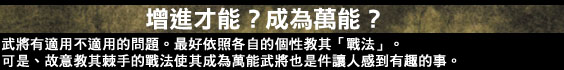 其中「戰法訓練所」是一定要去探訪。在那裡可以讓武將學得新的「戰法」。給那個武將什麼戰法是玩家的自由。希望您所辛勤栽培的最強軍團能稱霸中華。