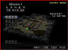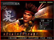 修羅既然是新的模式,那麼,不試玩看看怎麼行?聽說這個模式很不容易,但沒關係,我早就準備好必勝的秘招了。說是秘招,其實說穿了也沒什麼,我只是想辦法借來一片已經把武將練滿的記憶卡而已,但這就足夠我殺遍天下無敵手了,於是我自信滿滿的,選了我最愛用的甘寧。看你的了!老師! 不過,當我一進入遊戲,我就知道我錯了,這個修羅模式居然要從原始狀態開始,武將的能力也一切歸零,如果要用成長過的武將,就必須先在修羅模式的任務完成後,選擇〔終了〕的項目才行,而且,只要在任務中敗北,所有的能力也跟著陪葬,天啊,這個修羅模式實在太可怕了。不行,我不能就這樣被嚇到,還是先進行任務再說吧!就這樣,我連續破了幾關,意外中突然發現,道具的出現機率增加了,像「矢束」或暫時提昇能力的道具,三不五時就會蹦出來,不過,恢復體力的道具倒是沒看過幾次,算了,也沒差,反正我的體力也幾乎是滿的。