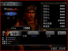 順利完成任務後,選好下一個目的地,就進入購物時間了,想買「肉包」或提高能力的道具,就要趁這時候購買,而且也好像只有這裡才能恢復體力,可是,肉包好貴啊,一個就要 600,看來以後作戰時要更小心謹慎一點,否則就算光買包子,也會荷包大失血了。 商店裡面,有很多只出現在修羅模式的寶物,像「山賊杯(雇用山賊作為我方部隊)」、「馱馬鐙(下個任務一開始就能騎著下等馬)」等等,都是一些古怪的東西。後來我為了想得到更多的武勳,所以買了「護衛依賴書(過關時商人還生存下來的話,可得到武勳1000)」(如果想保留道具,這時候就要選擇〔終了〕),只要在下個任務裡面,好好保護商人就行了。 「不用擔心,有我甘寧在,任何人都傷不了你一根寒毛。」 大話說出口了,但就在甘寧保護著商人且戰且走的時候,商人發出哀嚎。 「救、救命啊∼」 商人越跑越遠,而且是朝向敵方的大軍跑去,就這樣,商人終於跑到不見人影了,過沒幾分鐘,遠方就傳來他死亡的報告…。唉,猛虎難敵猴群,可憐的商人,你安息吧! 悲慘的事還不止如此,這場任務,最後以時間超過而宣佈失敗,像這種挑戰極限的修羅模式,應該慎選時機選擇〔終了〕來保存實力才對,如果太過於自信,可能就會像我這樣,因為一時疏忽而失去寶貴的道具了。