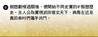 「無雙演武」是遊戲主要模式之一的長篇故事模式。與前作不同,非將焦點置於各武將身上,而是身為玩家分身的主人公,於戰國世界參與各場合戰,體驗至天下統一為止的歷史。除正史故事外,歷史迷務必會想親身體驗一次的「IF」假想故事,亦就此展開。