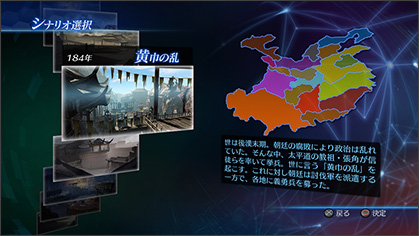 | 「184年 黃巾之亂」當中,闡述各個勢力為爭奪各地區統治權,虎視眈眈地相互爭奪霸主地位的故事。 | 根據選定武將,將決定君主、太守、在野等遊戲初始的地位。 |