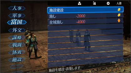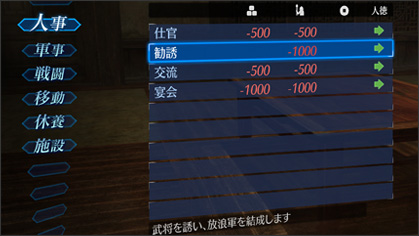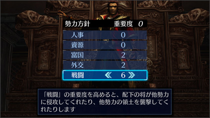 當玩家武將的地位是君主的情況下,可決定至下一次軍議為止,所要進行政略行動方針。