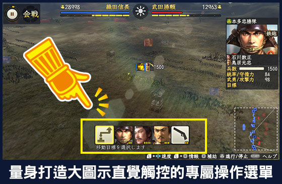 スクロールやズームイン/アウトはもちろん、 全国マップでは複数部隊をドラッグで一度に選択可能。 さらに、会戦画面では部隊の移動や攻撃対象をタッチで指定できる。 直感的な操作で縦横無尽に駆け巡れ!