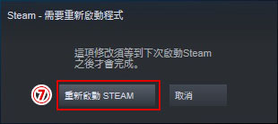 ⑦會提示需要重新啟動用戶端,請點選「重新啟動STEAM」項目。