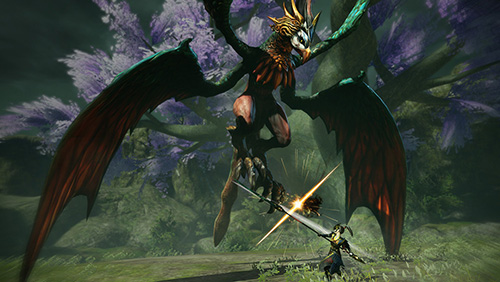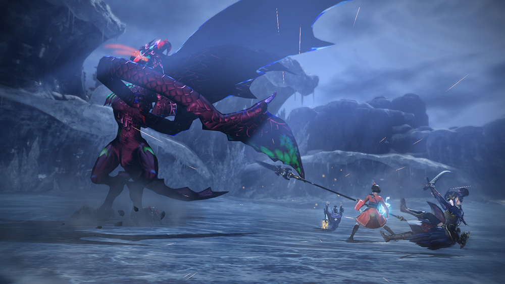 在冰原的嚴島神社,出現翡翠色翅膀的"鬼"喚。喚的攻擊方式有迴旋飛翔、振翅風暴等令人苦惱的攻擊方式。請運用防禦系技能,以遠距離武器等,擊落滯空的敵人。
