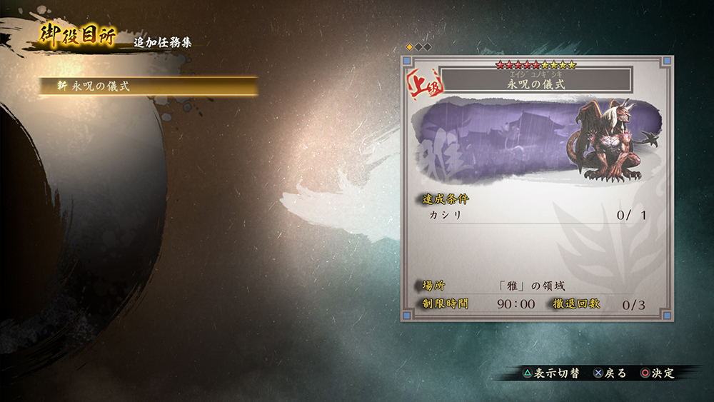 此任務的主要目的是討伐森羅睺,但是也收到朧"鬼"及黃金狢出沒的報告。請巡迴廣大的領域,一發現以上鬼,便起身討伐牠們!